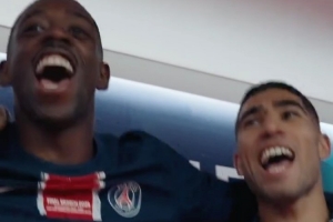 巴黎官方社媒晒出球员们在更衣室庆祝的视频,俱乐部主席纳赛尔与球员们一起唱歌。